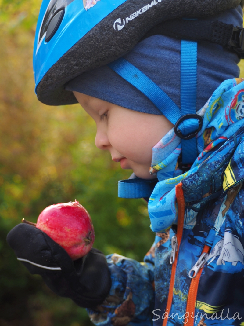 Tämähän tarkoittaa sitä, että tällä hetkellä perheessämme kaikki pyöräilevät ilman apupyöriä! Ässä otti ja lähti muutaman kannustuksen jälkeen ihan itse pyöräilemään. Ja olikin tosi kiva, että pyöräilykelejä oli vielä pitkälle syksyyn. Yksi päiväkodilta kotiin pyöräilyn kohokohtia oli myös erään talon edessä oleva ikean kassi, jossa oli lappu "Saa ottaa!" Pettymys olikin suuri, kun eräänä päivänä kassi olikin tyhjentynyt. Ei varmasti oltu ainoat jotka iloitsivat sen pihan omenasaaliista.